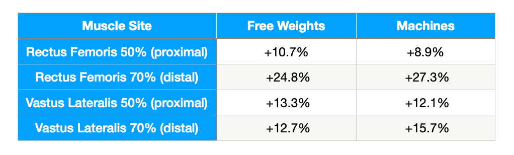 The study’s central question was whether free weights and machines drive comparable regional hypertrophy in the knee extensors, or whether one modality preferentially targets specific portions of the muscle. The researchers were interested in where growth occurred, not just whether it occurred, since proximal and distal hypertrophy patterns have practical relevance for programming and rehabilitation contexts.