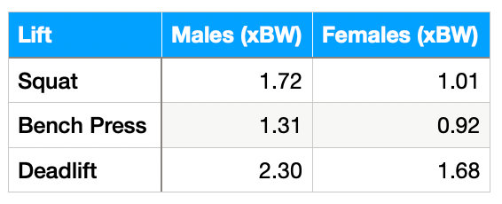 Strength Measurement: All lifts expressed relative to bodyweight (e.g., how many times your bodyweight you can lift).