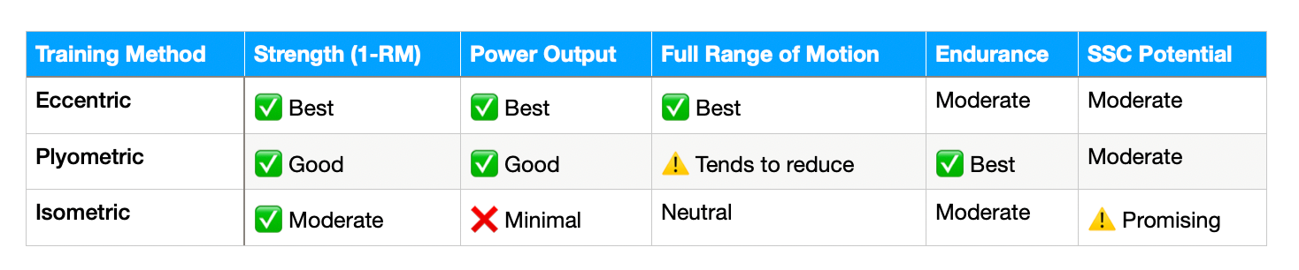 Eccentric training led all methods for power output and range of motion, while plyometric training was the only approach to significantly improve muscular endurance.