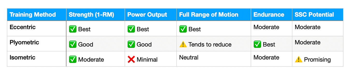 Isometric training underperformed — most likely because bodyweight lock-offs only load the muscles at roughly 55 to 75% of 1-RM. The existing literature suggests 80 to 100% of 1-RM is needed to drive meaningful isometric strength gains. At the right load, isometric training may prove more valuable, particularly for SSC and neuromuscular pre-activation.